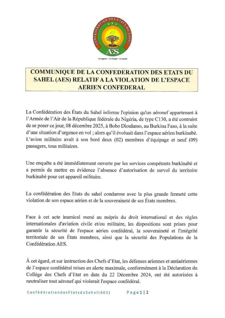 La Confédération des États du Sahel (AES) a annoncé ce lundi 8 décembre 2025 qu’un aéronef de type C-130, appartenant à l’Armée de l’Air de la République fédérale du Nigeria, a été contraint d’atterrir en urgence à l’aéroport de Bobo-Dioulasso, au Burkina Faso. L’appareil transportait deux membres d’équipage et neuf passagers, tous militaires.