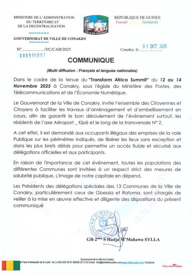 À l’approche du Transform Africa Summit, prévu du 12 au 14 novembre 2025 à Conakry sous l’égide du Ministère des Postes, des Télécommunications et de l’Économie numérique, le Gouvernorat de la ville de Conakry a publié ce vendredi 31 octobre 2025, un communiqué invitant les citoyens à faciliter les travaux d’aménagement et d’embellissement en cours dans la capitale.