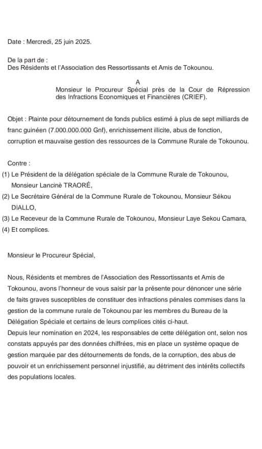 Conakry, le 25 juin 2025 – Des résidents et membres de l’Association des Ressortissants et Amis de Tokounou ont officiellement saisi le Procureur spécial près de la Cour de Répression des Infractions Économiques et Financières (CRIEF) au sujet d’un présumé détournement de fonds publics dans la Commune Rurale de Tokounou, située dans la préfecture de Kankan.