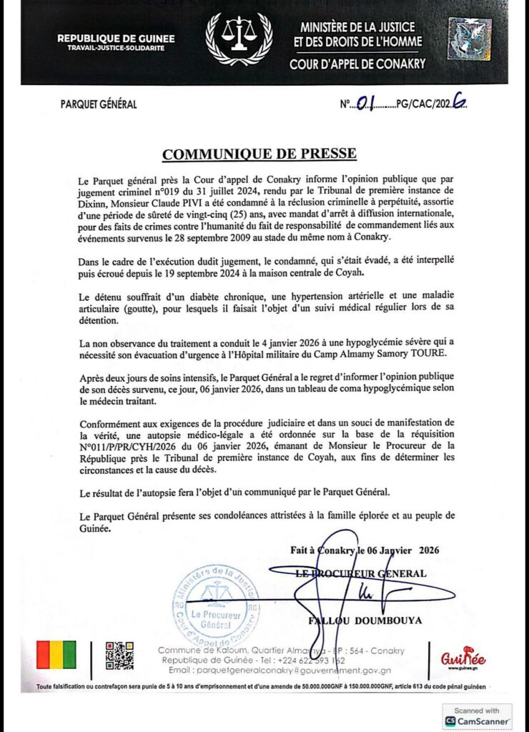 Le Parquet général près la Cour d’appel de Conakry a annoncé, ce mardi 6 janvier 2026, le décès de Claude Pivi, ancien haut responsable militaire, condamné à la réclusion criminelle à perpétuité pour crimes contre l’humanité en lien avec les événements du 28 septembre 2009.