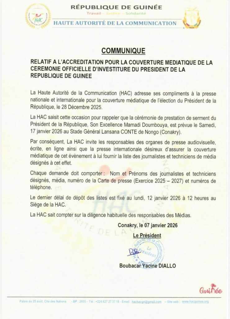La Haute Autorité de la Communication (HAC) a annoncé l’ouverture du processus d’accréditation des journalistes et organes de presse en vue de la couverture médiatique de la cérémonie officielle d’investiture du Président de la République de Guinée, Mamadi Doumbouya, prévue le 17 janvier 2026 à Conakry.