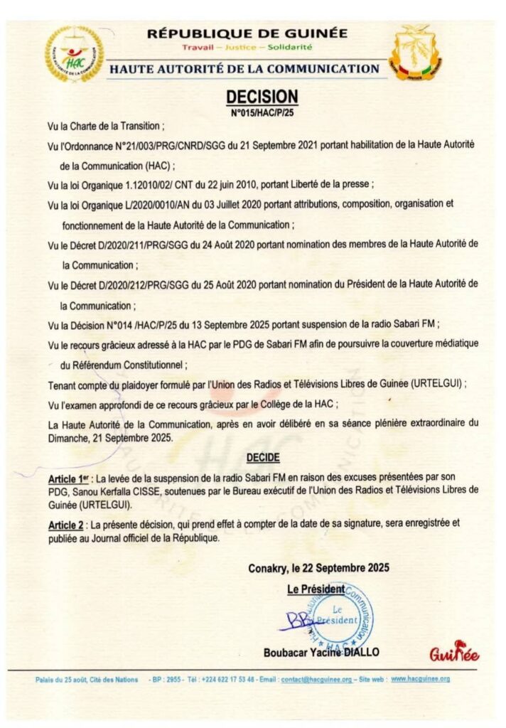 « La levée de la suspension de la radio Sabari FM est motivée par les excuses du PDG, soutenues par le bureau exécutif de l’URTELGUI », indique la décision signée par le président de la HAC, Boubacar Yacine Diallo.