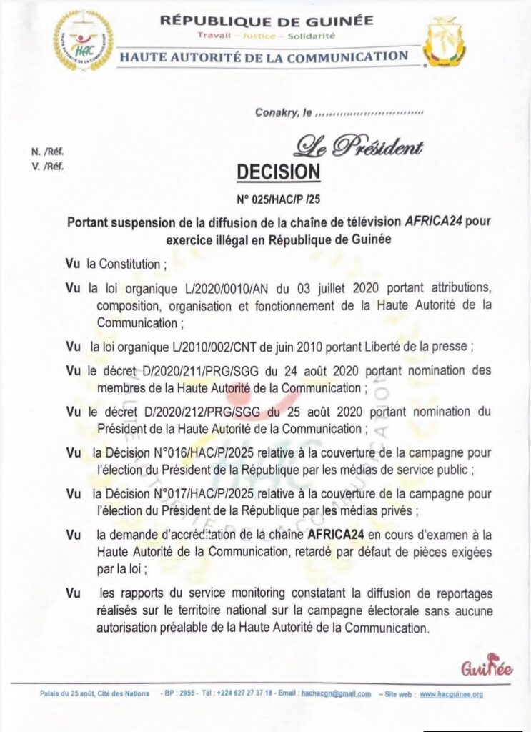 Dans son document officiel, la HAC indique que ses services de monitoring ont constaté la diffusion de reportages réalisés en Guinée par les équipes d’AFRICA24, en violation des textes en vigueur, notamment pendant la période sensible de la campagne électorale.