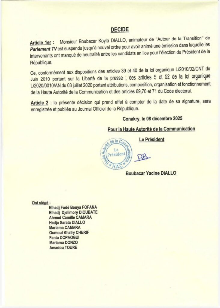 La Haute Autorité de la Communication (HAC) de Guinée a annoncé, ce lundi 08 décembre 2025,la suspension du journaliste Boubacar Koyla Diallo, animateur de l’émission « Autour de la Transition » diffusée sur Parlement TV. La décision fait suite au rapport de monitoring de la HAC concernant l’émission diffusée le dimanche 7 décembre 2025.