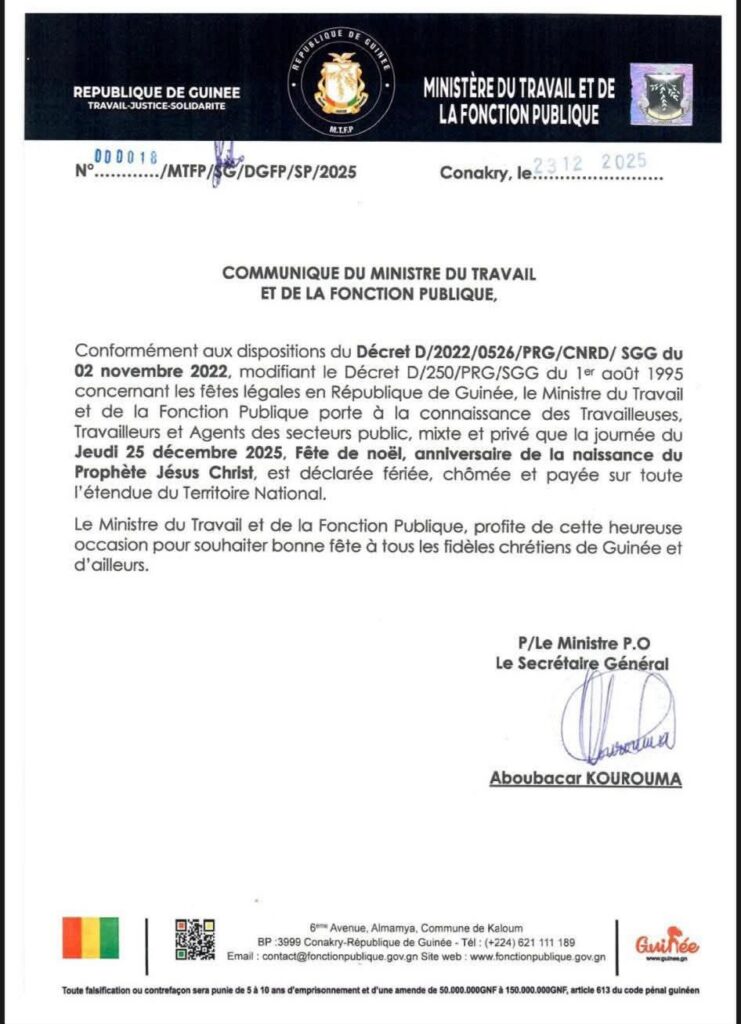 Conakry, 23 décembre 2025 – Le ministère du Travail et de la Fonction publique a annoncé que la journée du jeudi 25 décembre 2025, correspondant à la célébration de la fête de Noël, est déclarée fériée, chômée et payée sur toute l’étendue du territoire national.