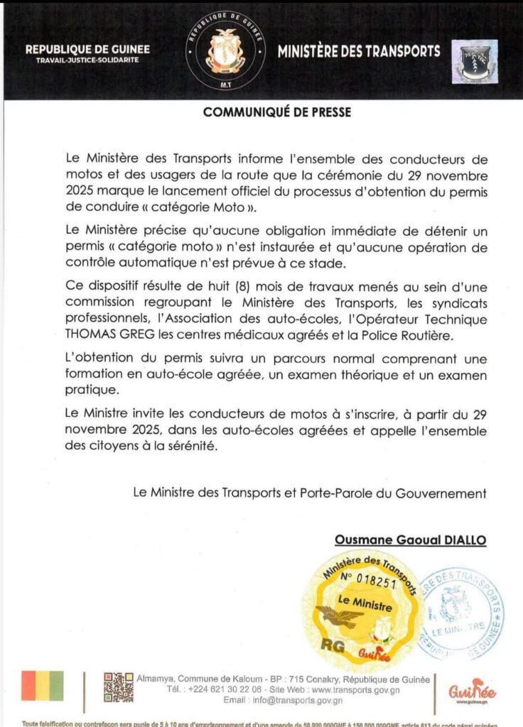 Le ministre des Transports et porte-parole du Gouvernement, Ousmane Gaoual Diallo, invite tous les conducteurs de motos à s’inscrire à partir du 29 novembre 2025 dans les auto-écoles agréées.