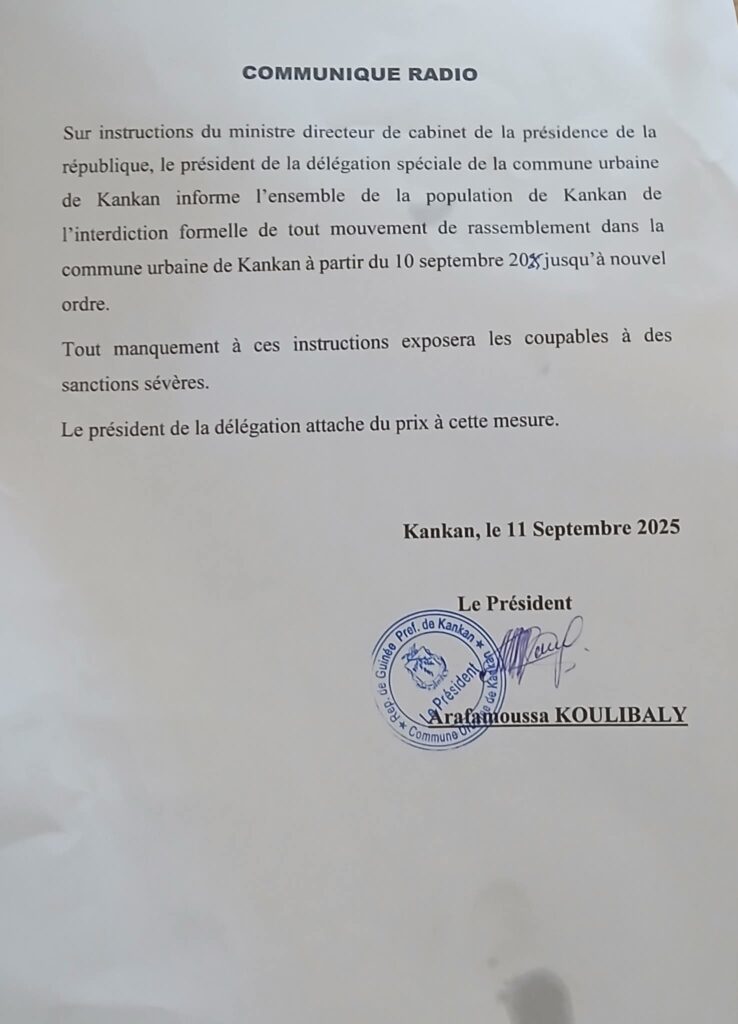 Le président de la délégation spéciale de la commune urbaine de Kankan, Arafanoussa Koulibaly, a annoncé ce jeudi 11 septembre 2025, l’interdiction formelle de tout mouvement de rassemblement dans la ville, et ce jusqu’à nouvel ordre.