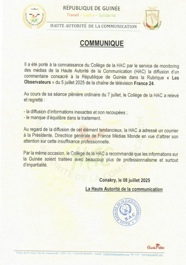 La Haute Autorité de la Communication (HAC) a exprimé de vives préoccupations concernant un contenu diffusé le 5 juillet dernier dans la rubrique « Les Observateurs » sur la chaîne France 24, traitant de la situation en République de Guinée.
