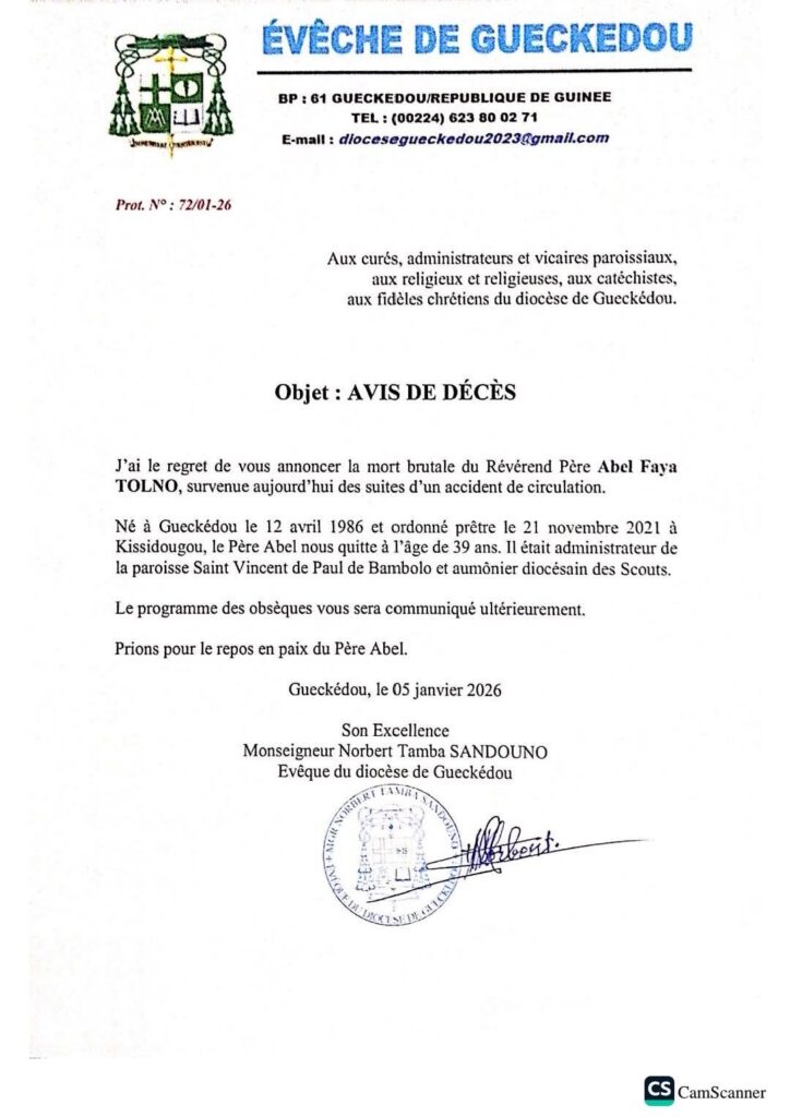 Le diocèse catholique de Guéckédou est en deuil. Dans un communiqué officiel publié ce 5 janvier 2026, l’évêché de Guéckédou a annoncé le décès brutal du Révérend Père Abel Faya Tolno, survenu des suites d’un accident de la circulation.