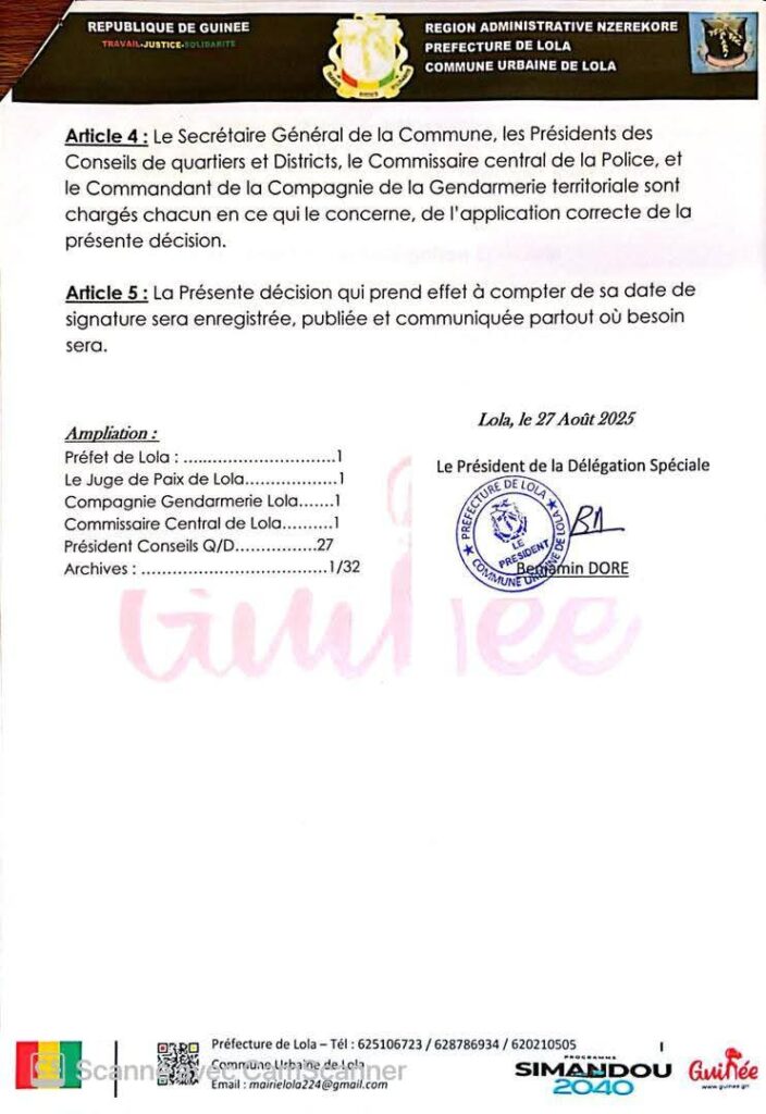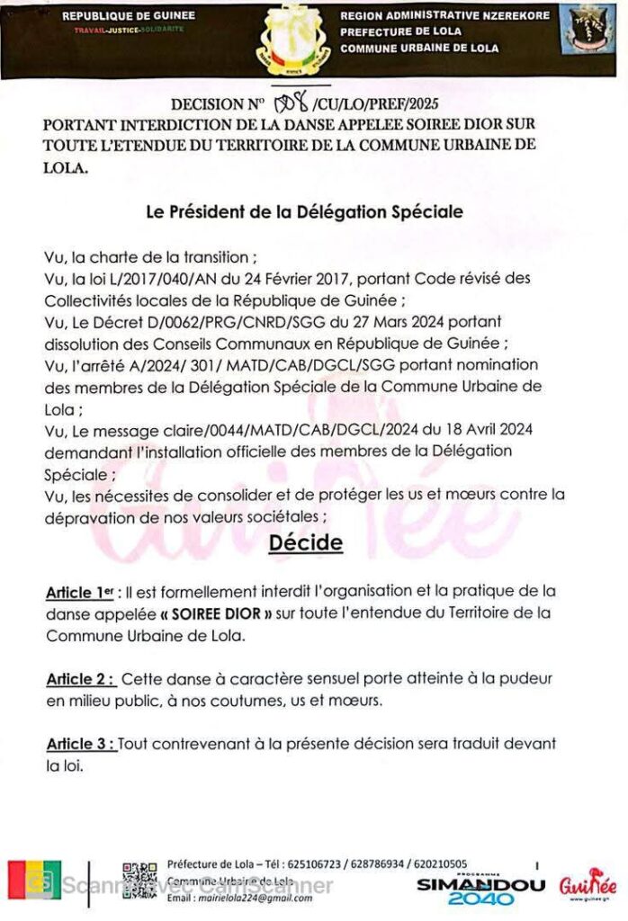 Dans une décision officielle datée du 27 août 2025, le président de la Délégation spéciale de Lola, Benjamin Doré, a formellement proscrit l’organisation et la pratique de cette danse sur toute l’étendue du territoire communal.Selon le document, la « soirée Dior » est jugée contraire aux coutumes, aux us et mœurs du pays, car elle « porte atteinte à la pudeur en milieu public »et contribue à « la dépravation des valeurs sociétales ».