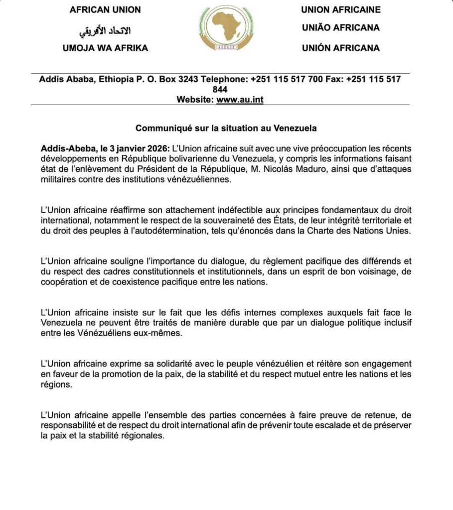 Addis-Abeba – L’Union africaine (UA) a exprimé, ce jour, sa vive préoccupation face aux récents développements en République bolivarienne du Venezuela, notamment les informations faisant état de la capture du président Nicolás Maduro par les États-Unis, ainsi que d’attaques militaires visant des institutions vénézuéliennes.