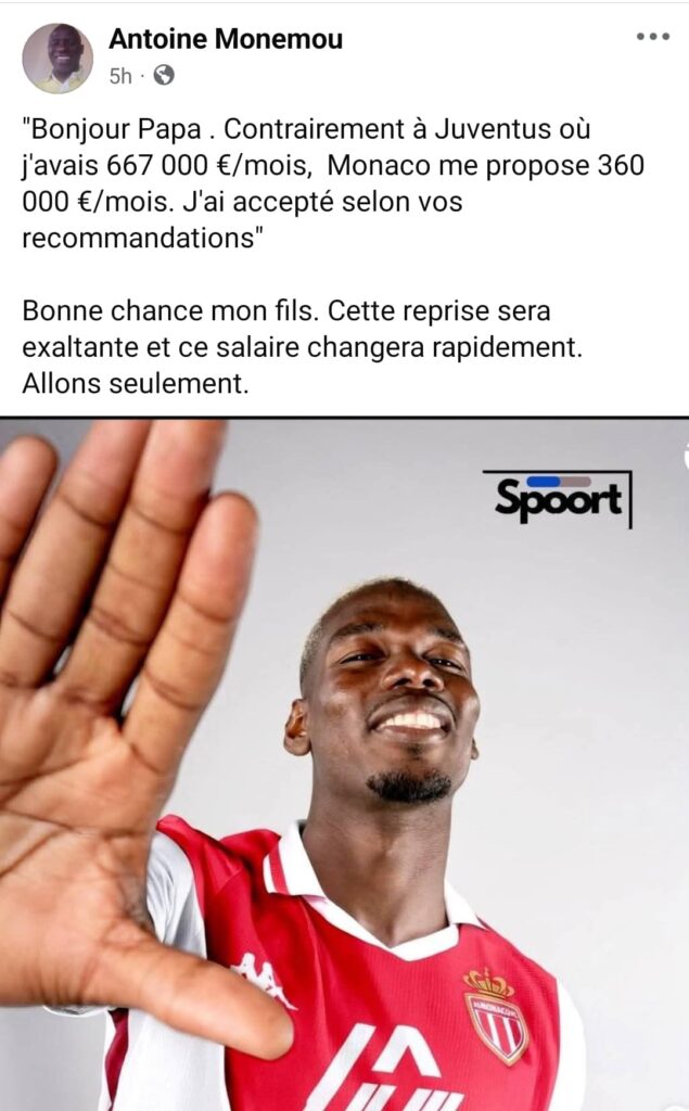 Dans un message privé adressé à sa famille, notamment à Dr Antoine Monémou homonyme de son père Pogba a expliqué les raisons de son choix. Le message a été partagé publiquement sur Facebook. « Bonjour Papa (Antoine, NDLR). Contrairement à la Juventus où je gagnais 667 000 €/mois, Monaco me propose 360 000 €/mois. J’ai accepté, comme vous me l’aviez conseillé », écrit-il.