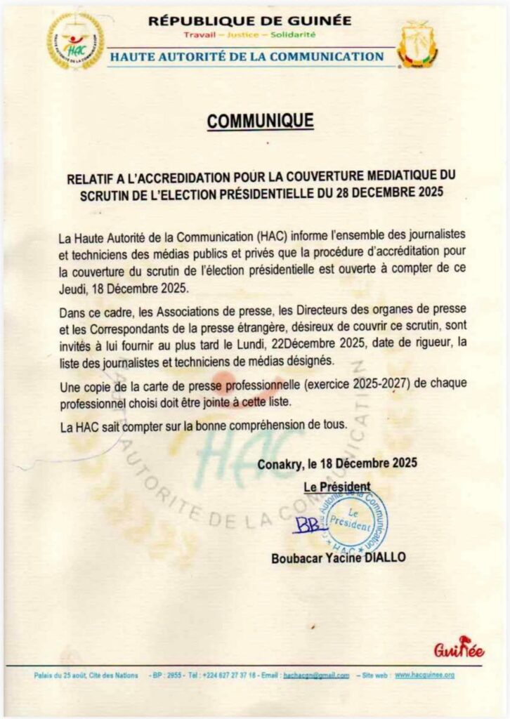 La Haute Autorité de la Communication (HAC) a annoncé l’ouverture de la procédure d’accréditation des journalistes et techniciens des médias publics et privés pour la couverture du scrutin de l’élection présidentielle prévu le 28 décembre 2025.